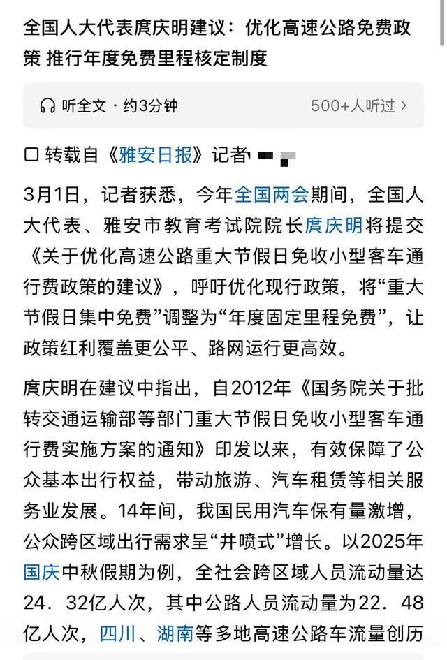 总的来说,庹庆明代表的这个建议,是一次值得肯定的尝试。它让我们看到了高速公路免费政策的另一种可能,也让我们开始思考:一个政策如何能在“普惠”和“公平”之间找到更好的平衡点?