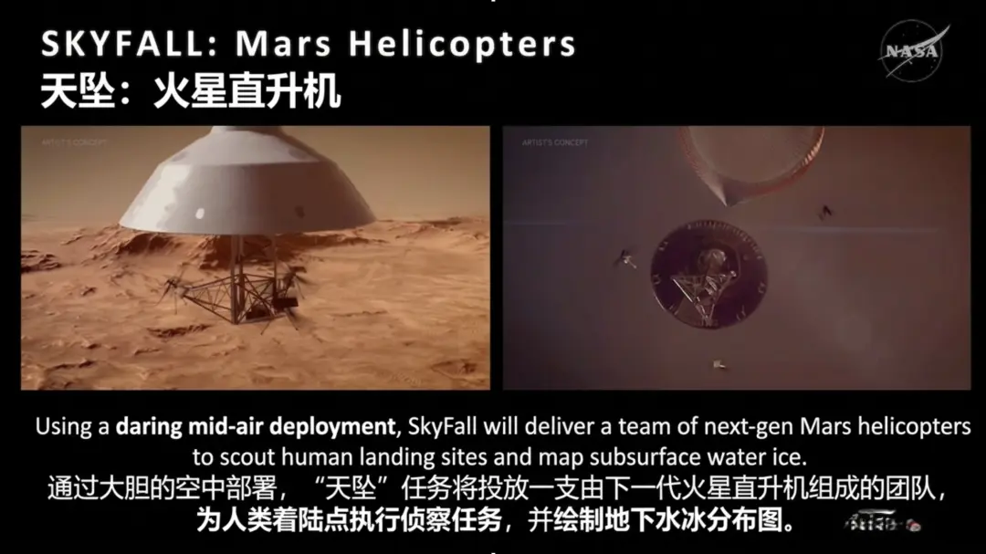 “这些直升机将携带摄像头和探地雷达,为未来人类登陆器寻找安全的着陆点。它们会详细勘察地形坡度、潜在危险,并绘制地下水冰分布图,确定水冰的位置、储量、埋藏深度,这些信息对于未来人类在火星生存至关重要。”