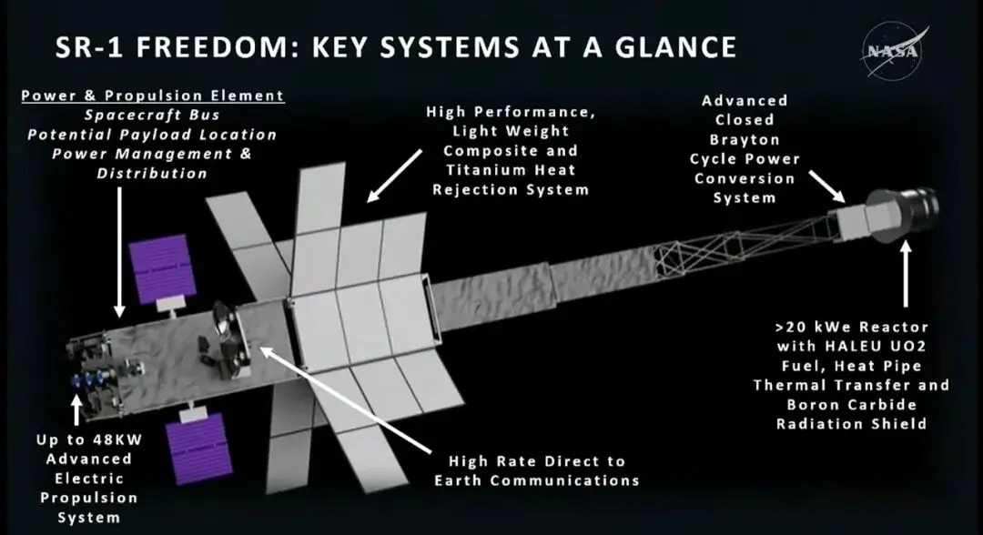 本次任务最引人瞩目的,并非火星上空飞舞的直升机群,而是它们前往火星的“座驾”,“太空反应堆-1号 自由号”(Space Reactor-1 Freedom)。