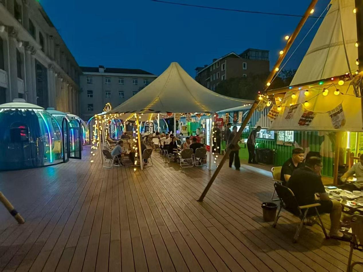 此时此刻,泓德酒店、海德酒店、茂业万豪酒店、九悦餐饮等各大高端酒店门前的美食市集也正散发着独特的魅力。泓德酒店门前,一个个星空房里座无虚席,师傅们正忙着为客人烤串。新鲜的生蚝在炭火上滋滋冒汁,撒上蒜蓉和粉丝后,鲜美的味道让人垂涎欲滴。