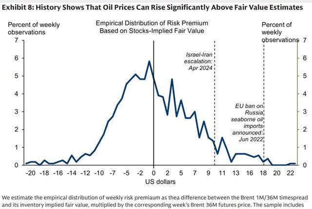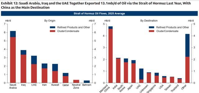 当然,目前市场对油价能冲到多少有分歧,高盛觉得如果霍尔木兹海峡运输完全中断一个月,充分利用备用管道和战略储备的情况下,油价也会上涨10美元左右。但是如果考虑恐慌溢价,布伦特原油可能会试探110美元的峰值。