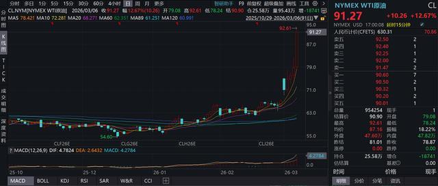 昨天WTI原油期货收盘价为91.27美元,单日暴涨12.67%,本周累计涨幅36.18%。