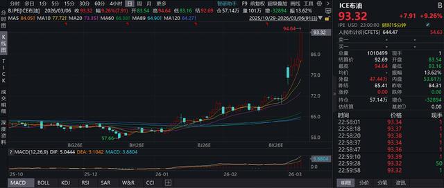 布伦特原油收报93.32美元,单日涨幅9.26%,本周累计涨28.06%。