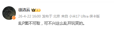 4月22日下午,小米集团董事长特别助理、战略市场部副总经理徐洁云在微博回应表示:“乱P图不可取,可不兴这么乱开玩笑。”