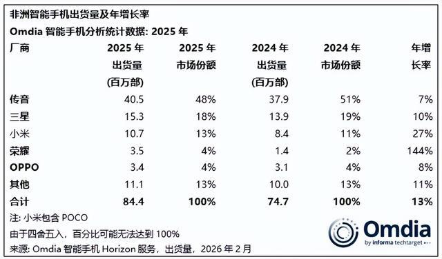 排名第四的是荣耀,它的出货量为350万台,市场份额为4%,同比增长114%。作为横向对比,2024年荣耀出货量仅为140万台,相当于2025年增长了210万台,称其为2025年非洲最大的黑马没毛病吧。荣耀的增长得益于拓展全新的市场,凭借X系列和中端定位产品实现扩张,并且与当地运营商加强合作,提升品牌影响力和销售渠道。