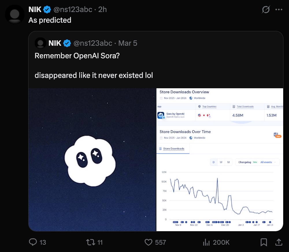 知名AI博主NIK则直言“As predicted”,并翻出此前判断“Sora会消失”的旧帖,称其结局早有预兆。其此前晒出的下载量曲线图中,Sora热度一路下滑。